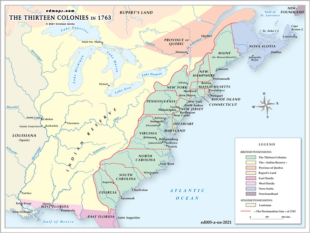 In 1763, following the Treaty of Paris that ended the Seven Years' War (French and Indian War), the thirteen American colonies existed within a dramatically transformed territorial landscape under British rule.